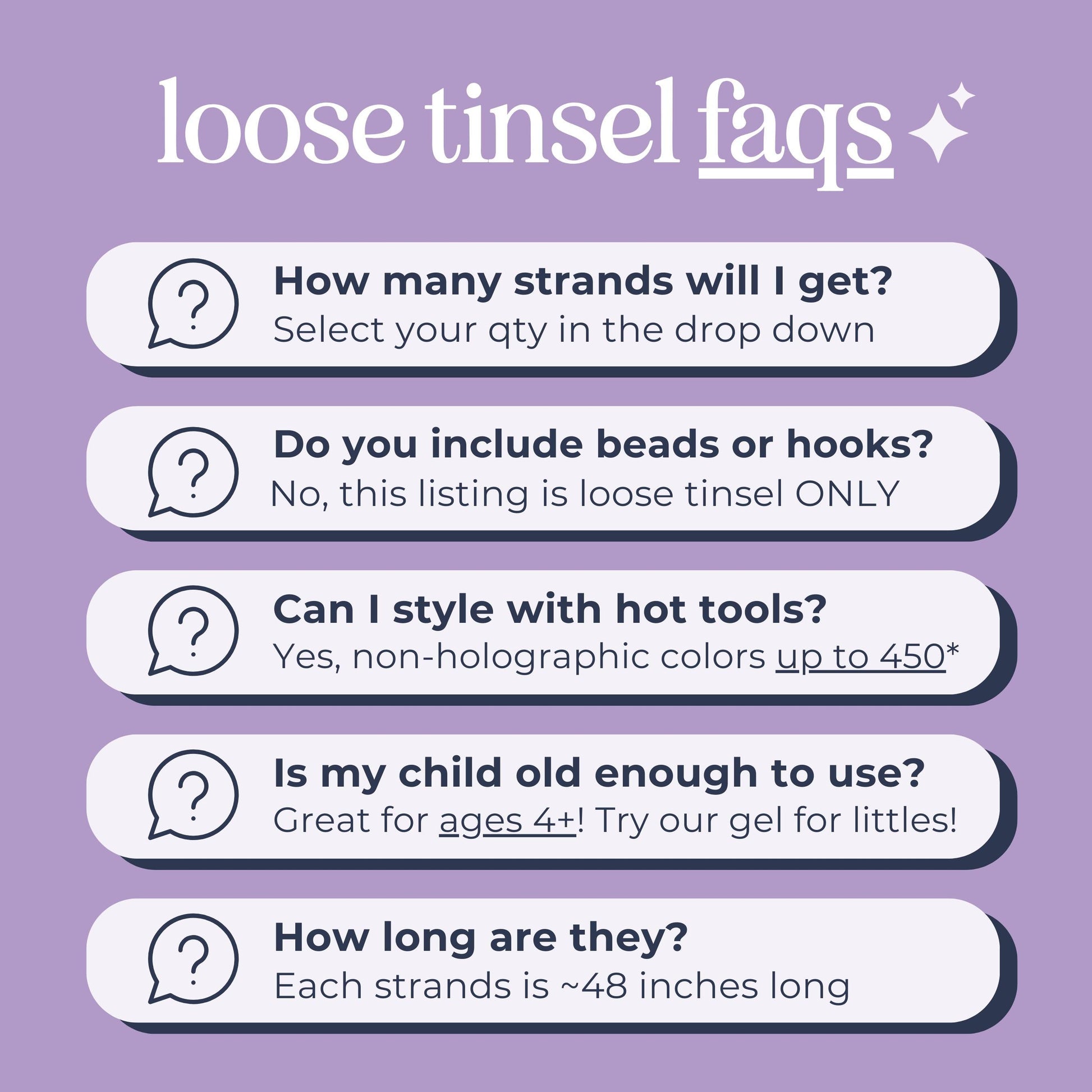 Safety Note: Recommended for ages 4+ due to potential choking or strangulation hazard. Check out our tinsel hair gel for kids under 4 years old.