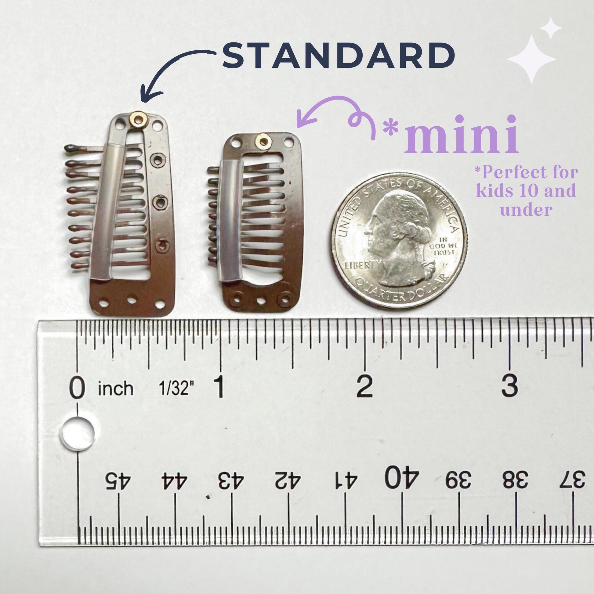 Standard clips are our most popular choice — perfect for most hair types and styles. If you’re shopping for kiddos under 10 or anyone with fine, delicate strands, we recommend choosing Mini clips for the most comfortable, secure fit.